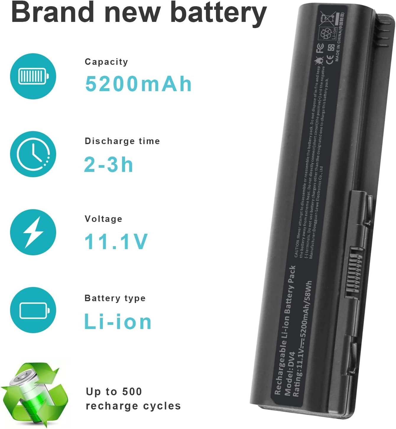 - 5200 mAH y 58 Wh, 1 año de garantía; esta batería de repuesto OEM de 6 celdas de 10.8 V puede suministrar una salida de potencia de 58 Wh, hecha para reemplazo de computadora Hewlett Packard HP Pavillion, baterías extendidas de larga duración y batería primaria Compaq Presario de 6 celdas para piezas de repuesto de rendimiento máximo 484171-001 48444 172-0 01 497694-001 511872-001 ev06 5200mAh.